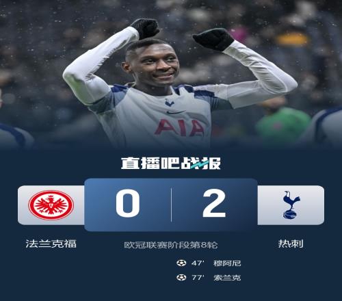 体育播报01月29日宣 欧冠联赛阶段第8轮战罢,热刺2-0力克法兰克福,以联赛阶段第4的成绩直通15强。球队在本届欧冠联赛阶段8轮5胜2平1负。